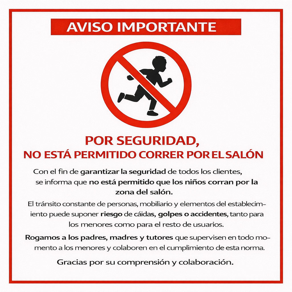 Con el fin de garantizar la seguridad de todos los usuarios, se informa de que no está permitido que los niños corran por la zona del salón.