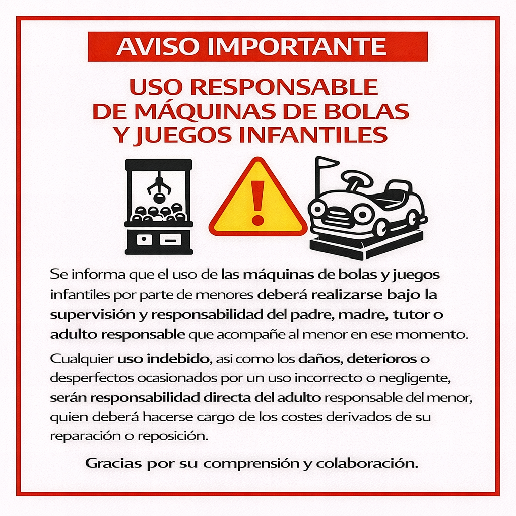 Se informa que el uso de las máquinas de bolas y juegos infantiles por parte de menores deberá realizarse bajo la supervisión y responsabilidad del padre, madre, tutor o adulto responsable que acompañe al menor en ese momento.