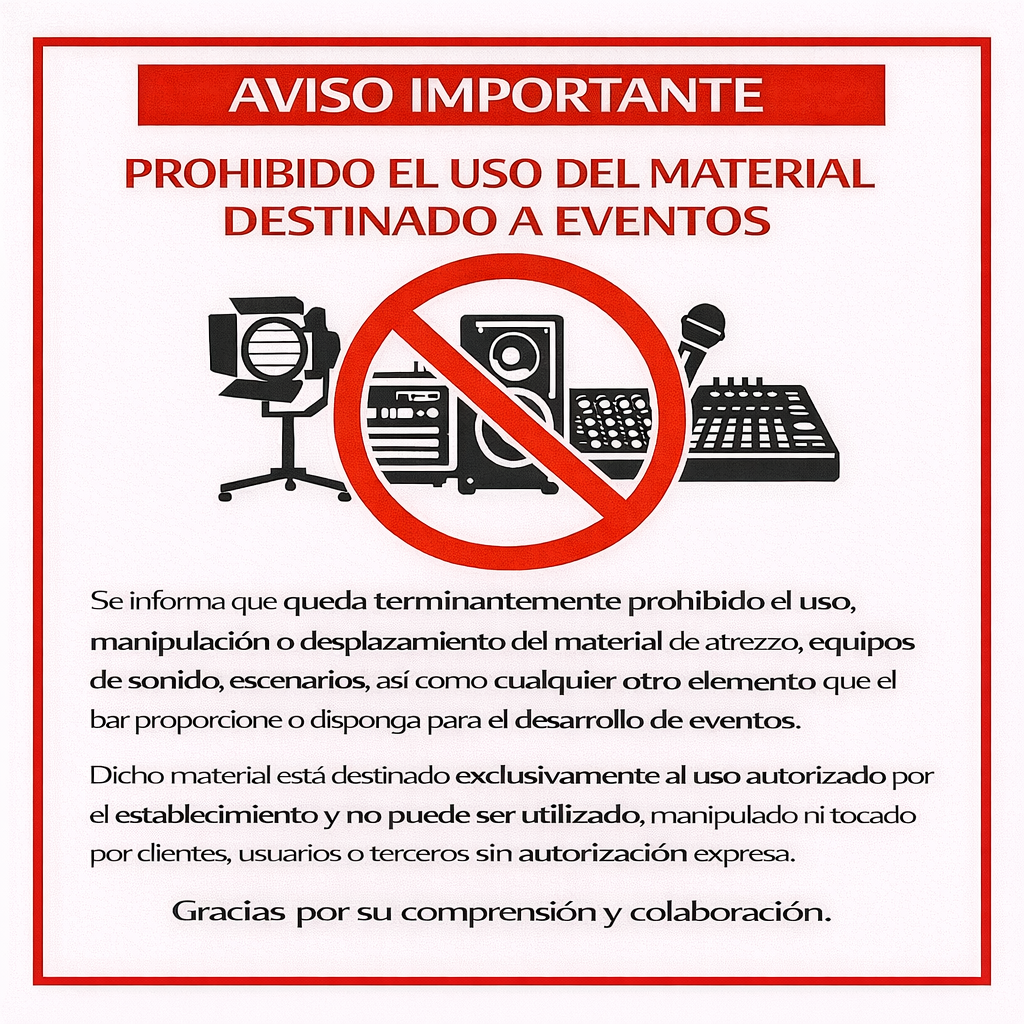Se informa que queda terminantemente prohibido el uso, manipulación o desplazamiento del material de atrezzo, equipos de sonido, escenarios, así como de cualquier otro elemento que el bar proporcione o disponga para el desarrollo de eventos.