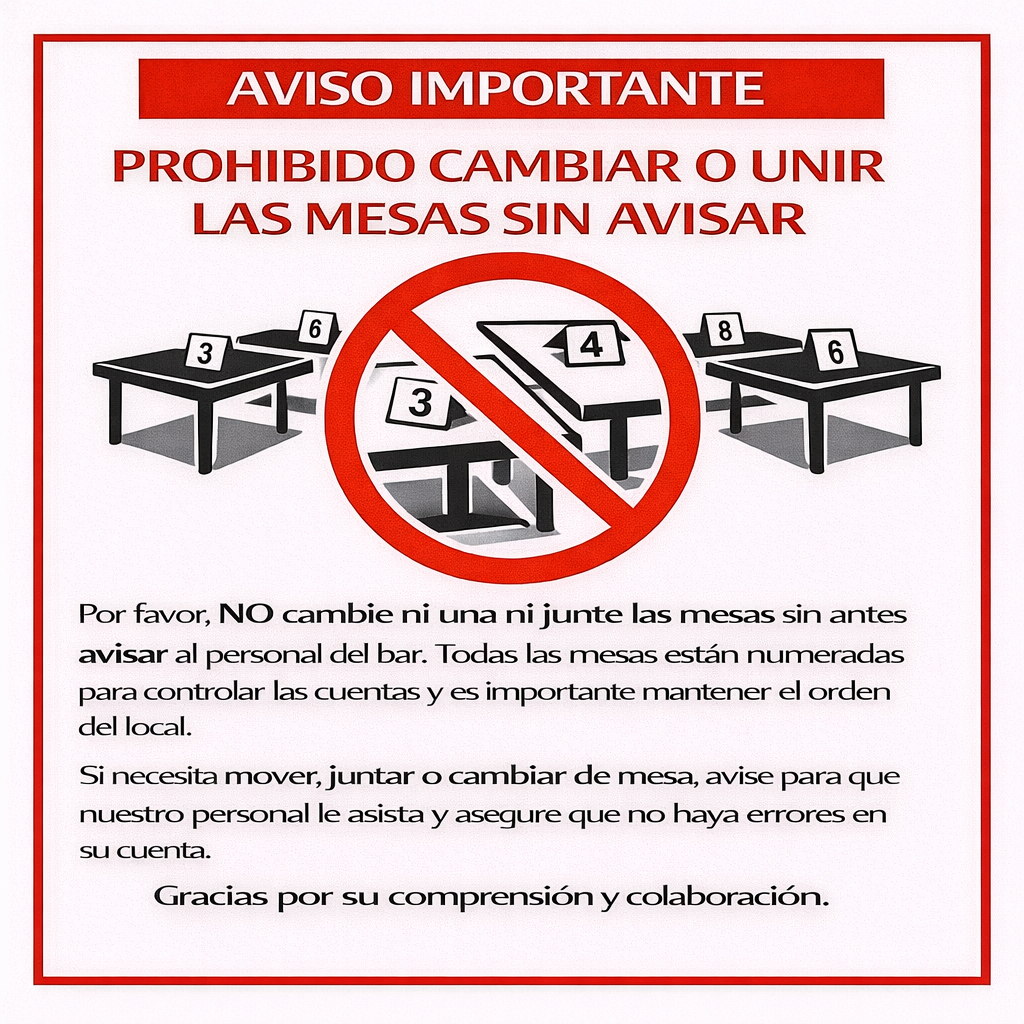 Por favor, no cambie ni una ni una las mesas, ni las una, sin avisar previamente al personal del bar.