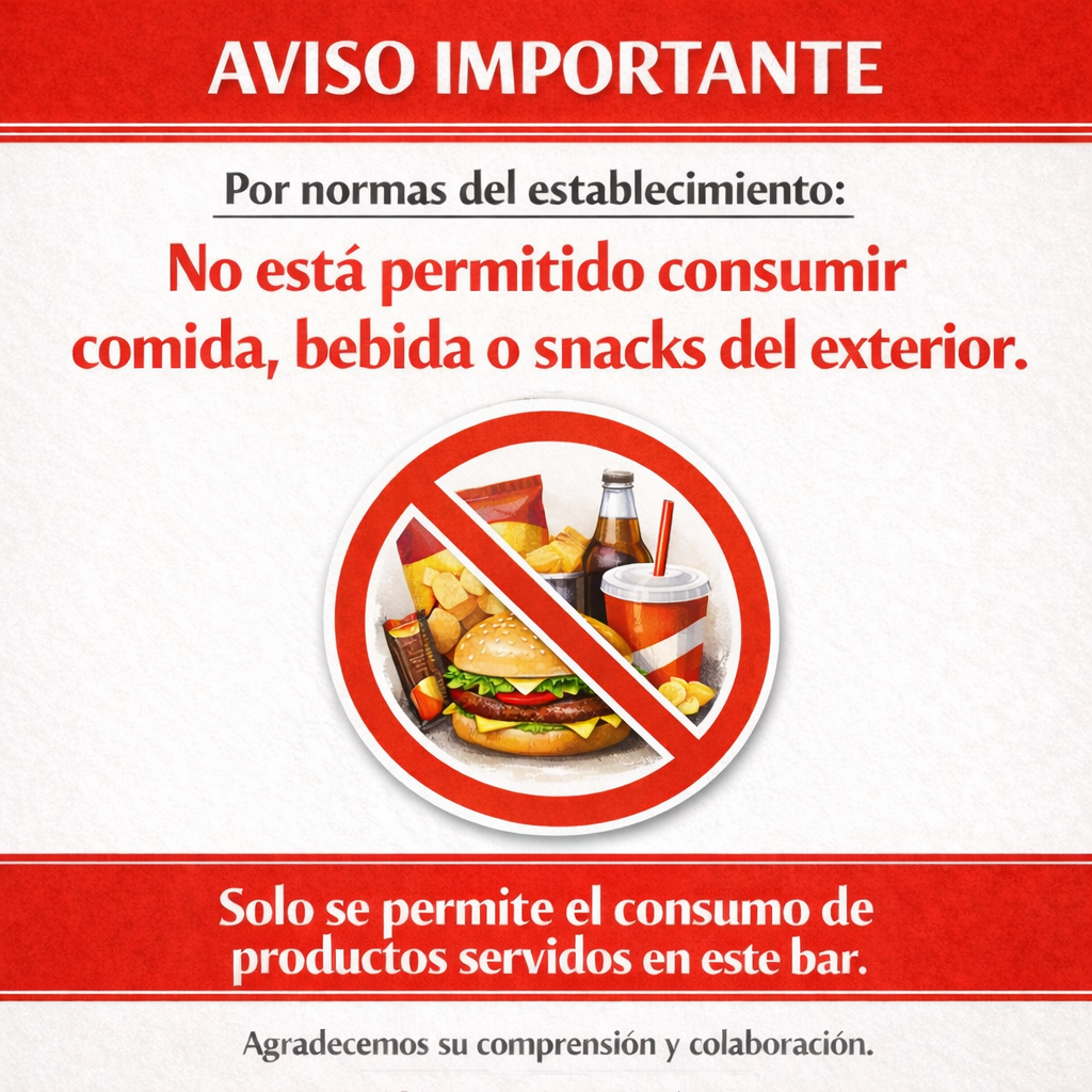 Por normas del establecimiento, no está permitido consumir comida, bebida ni snacks procedentes del exterior dentro de nuestras instalaciones.