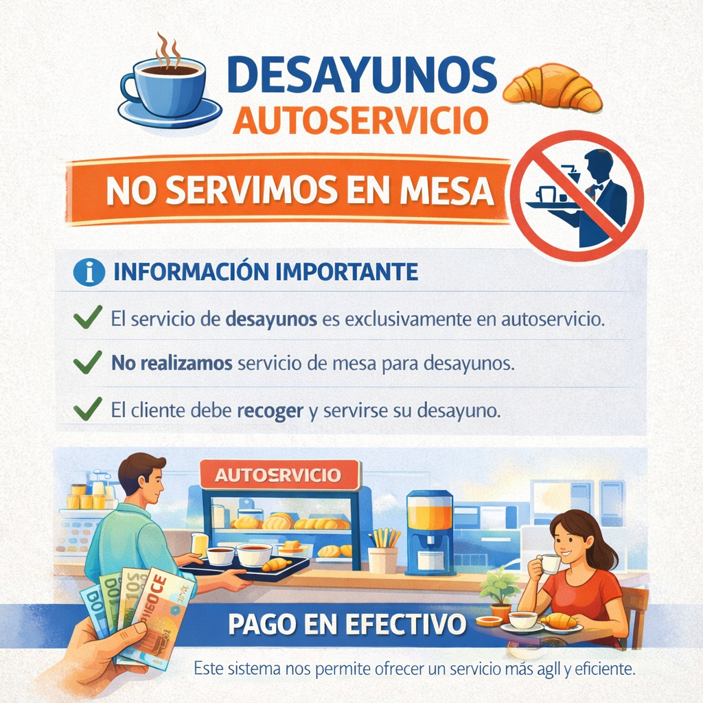 Les informamos que el servicio de desayunos se realiza exclusivamente en autoservicio.