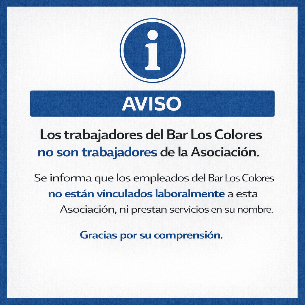 Se informa que el personal del Bar Los Colores no mantiene relación laboral alguna con la Asociación, por lo que no desempeña ni puede desempeñar funciones, tareas o trabajos que no correspondan exclusivamente a la actividad propia del bar.