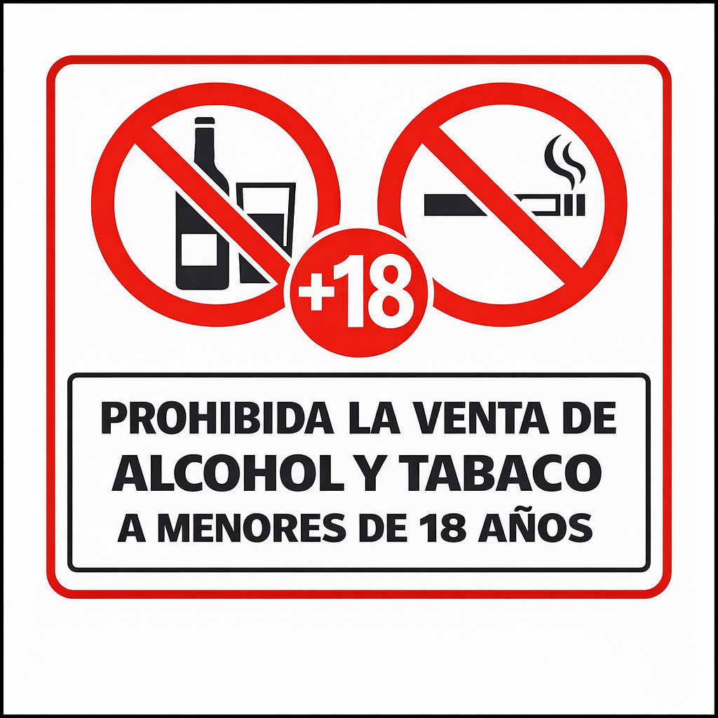 Queda prohibida la venta y suministro de bebidas alcohólicas y productos del tabaco a menores de 18 años, conforme a la legislación vigente.